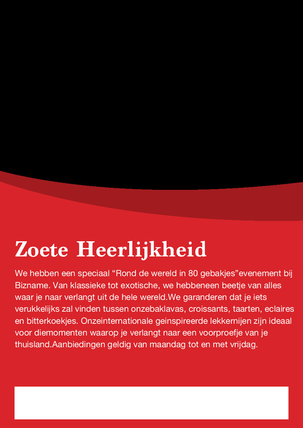 We hebben een speciaal “Rond de wereld in 80 gebakjes”evenement bij Bizname. Van klassieke tot exotische, we hebbeneen beetje van alles waar je naar verlangt uit de hele wereld.We garanderen dat je iets verukkelijks zal vinden tussen onzebaklavas, croissants, taarten, eclaires en bitterkoekjes. Onzeinternationale geinspireerde lekkernijen zijn ideaal voor diemomenten waarop je verlangt naar een voorproefje van je thuisland.Aanbiedingen geldig van maandag tot en met vrijdag.